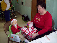 Mommy helped me open my present. I had to taste the wrapping paper - it had snow men on it and I just wanted a little lick of them. It also gave everyone a chance to see how strong my new teeth are because I tried to open my present by tearing the paper off with them.
